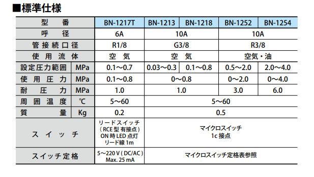 日本精器的压力开关BN-1213/BN-1218/BN-1252/BN-1254